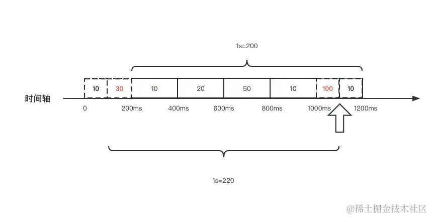 假设设定1秒内允许通过的请求是200个,这里把1秒的时间分成多格,假设分成5格(格数越多,流量过渡越平滑),每格窗口的时间大小是200毫秒,每过200毫秒,就将窗口向前移动一格。通过观察下图,可以得知在当前窗口只要超过110就会被限流。