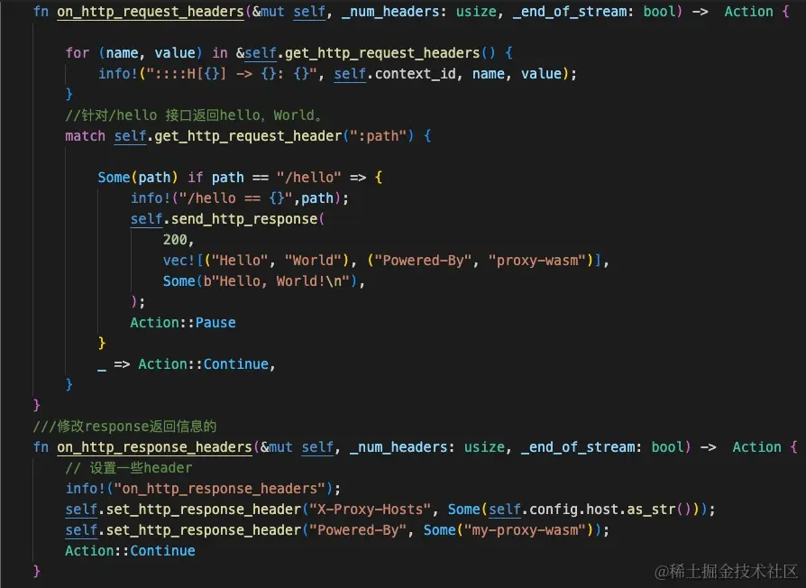 在 src/lib.rs中编写你的插件代码。实现 proxy-wasm 提供的接口,如 HttpContext或 RootContext。如下是一个 对/hello 接口返回“hello,World”并添加response header。