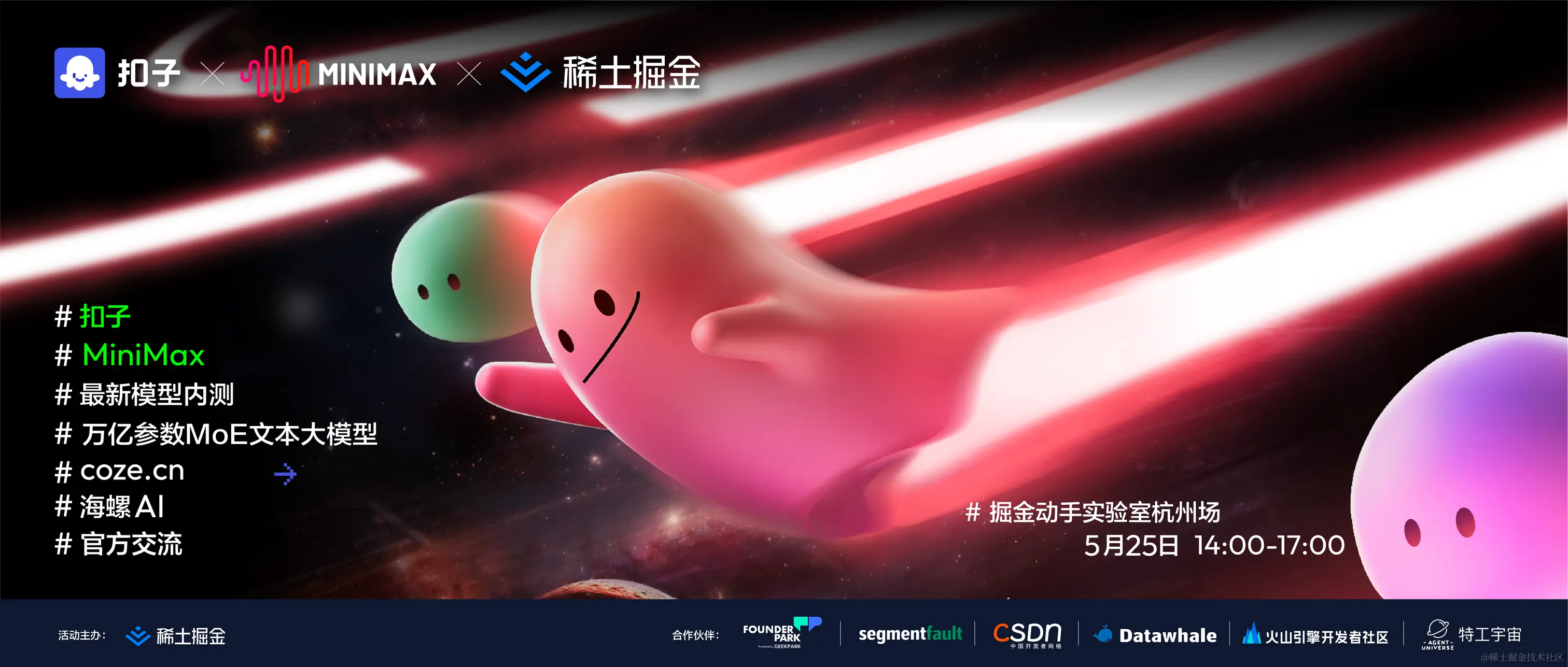 动手实验室的第五期携手MiniMax,期待开发者们能来线下使用MiniMax abab6.5-chat-pro模型进行bot的制作。5月25日和您相约杭州平安金融中心工区~快来一起了解下活动内容吧!