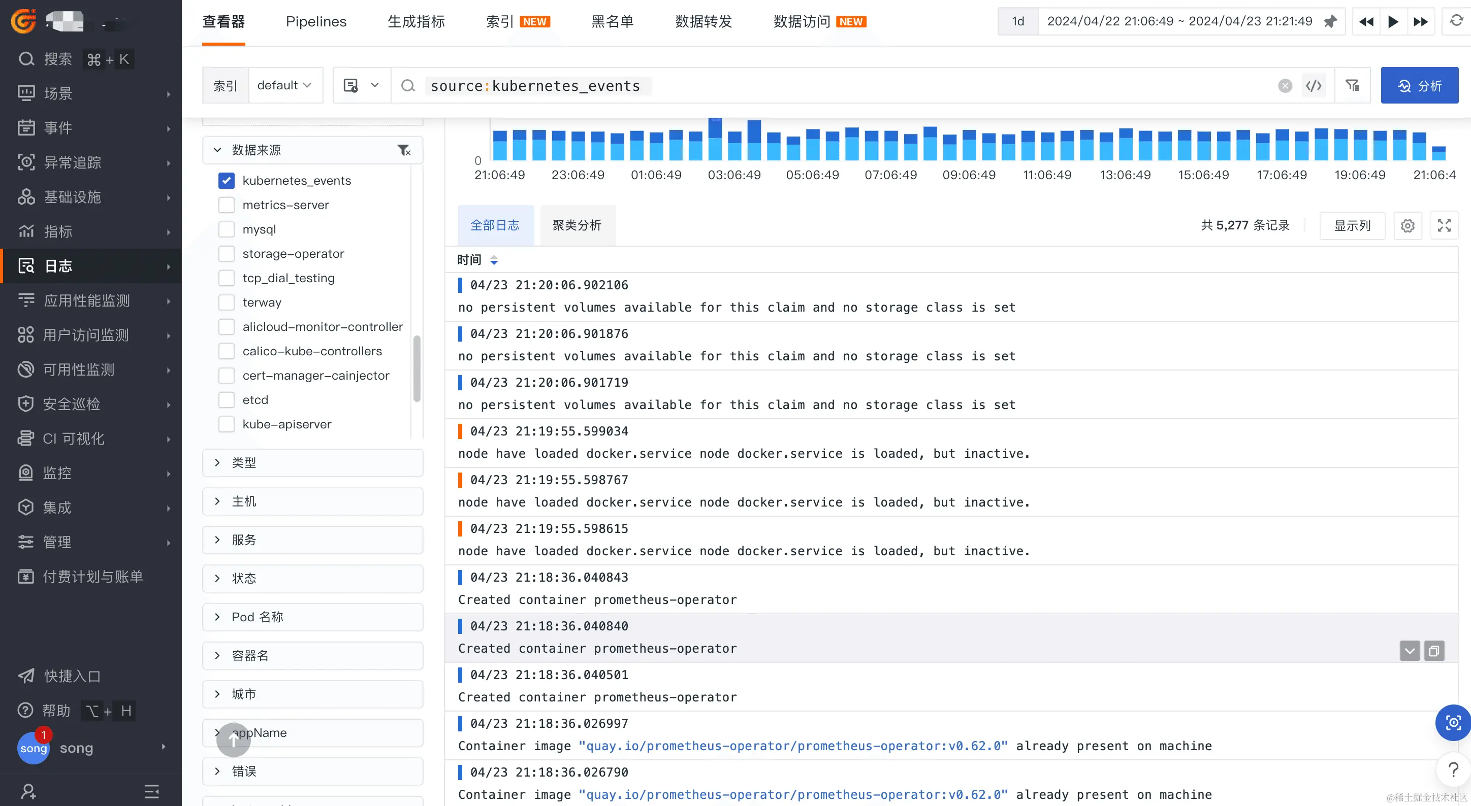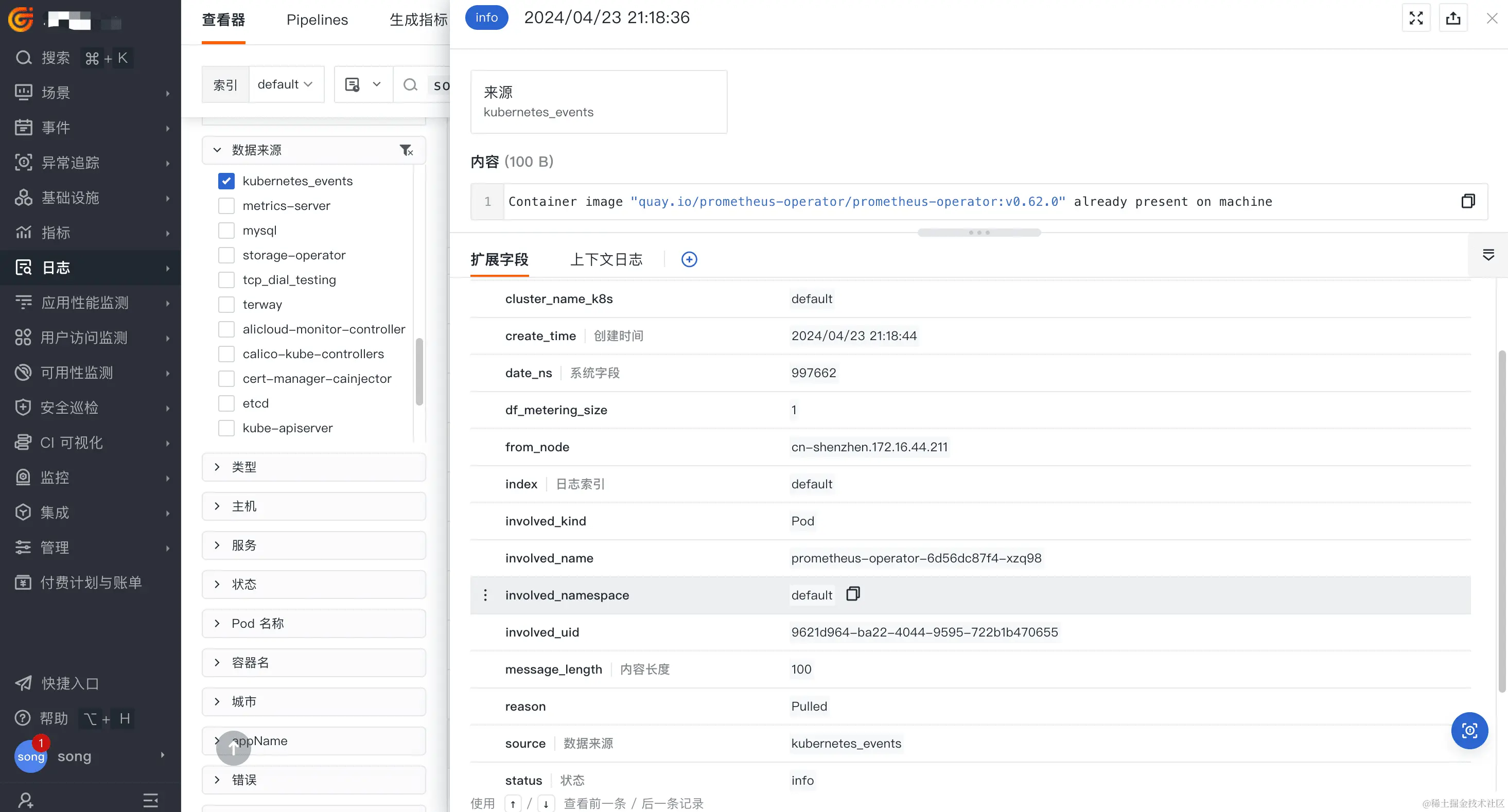 DataKit 默认采集了 Kubernetes 的 Event 日志。登录观测云控制台,点击「日志」 -「查看器」 ,可以看到已经采集到的 Kubernetes Event 日志。