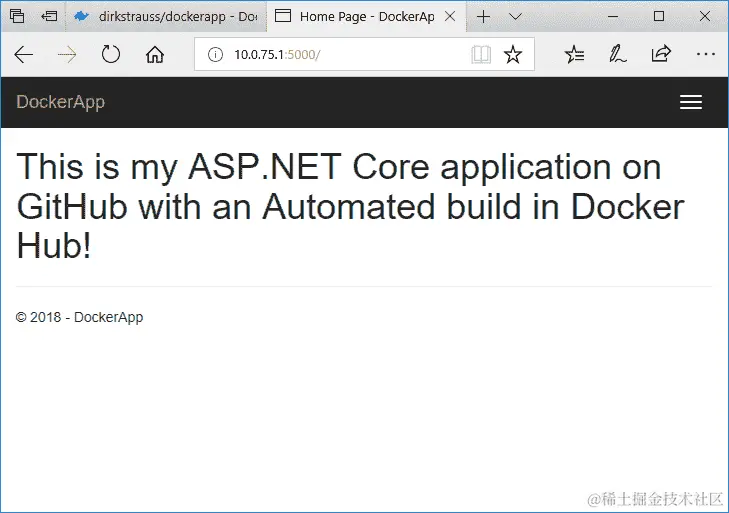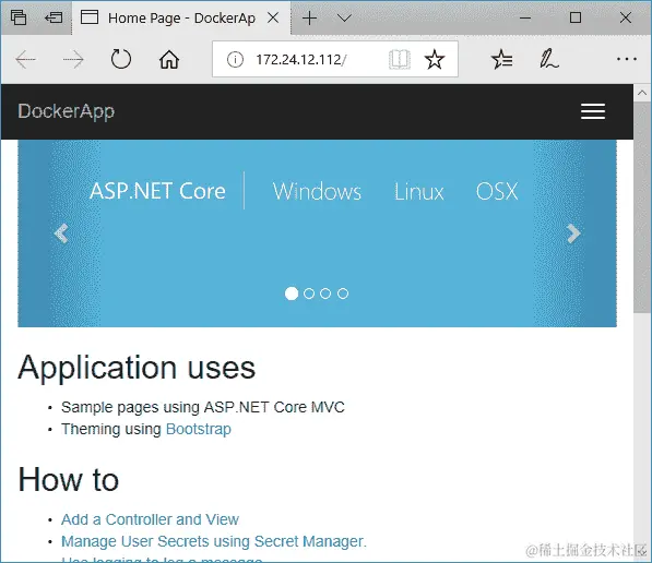 启动浏览器后,您将看到 ASP.NET Core 应用程序正在以前在“输出”窗口中列出的 IP 地址上运行。您的 ASP.NET Core 应用程序现在正在 Windows Docker 容器中运行: