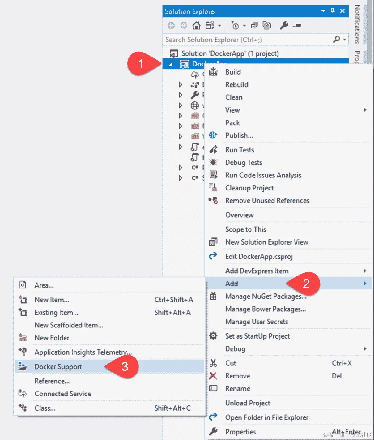 假设您有一个不支持 Docker 的 ASP.NET Core 应用程序。要为此现有应用程序添加 Docker 支持,只需从上下文菜单中添加即可: