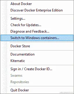 如果您在任务栏中的 Docker 图标上右键单击,您将看到您有一个选项在那里启用 Windows 容器。您可以通过单击任务栏中的 Docker 图标上的“切换到 Windows 容器”选项切换到 Windows 容器: