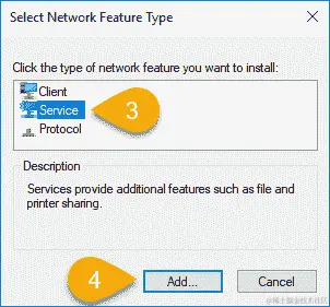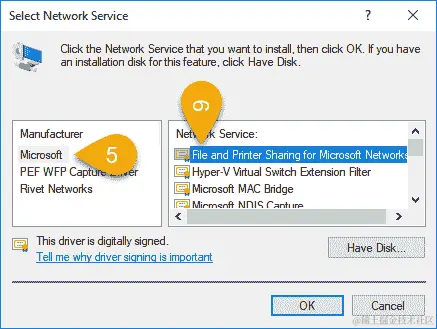 - 在“选择网络服务”屏幕上,选择 Microsoft 作为制造商,然后单击“Microsoft 网络的文件和打印机共享”服务:
