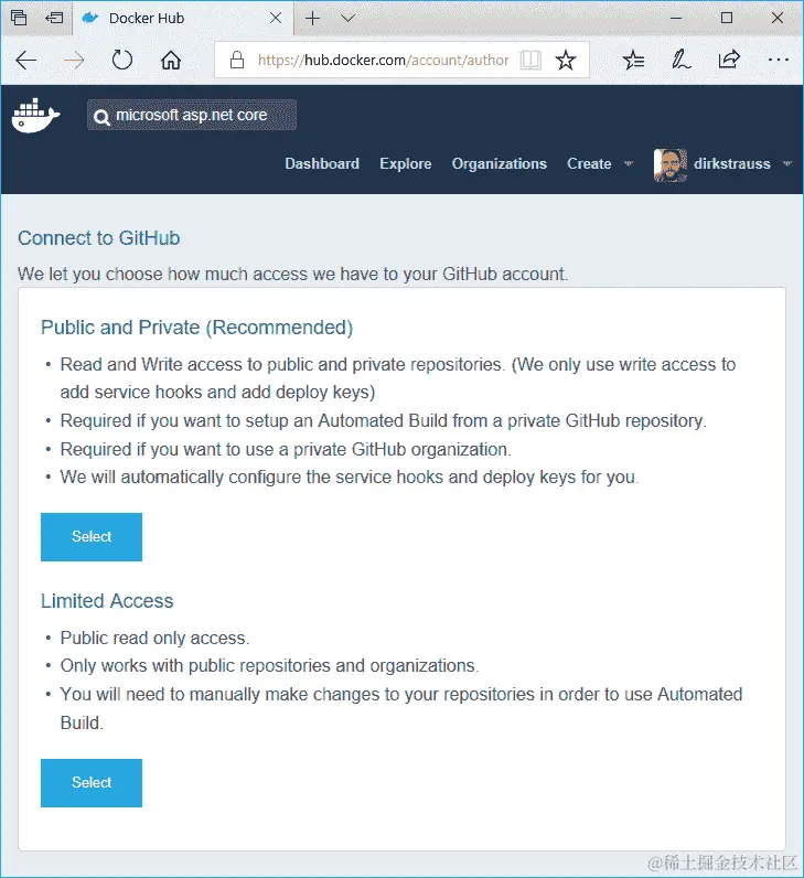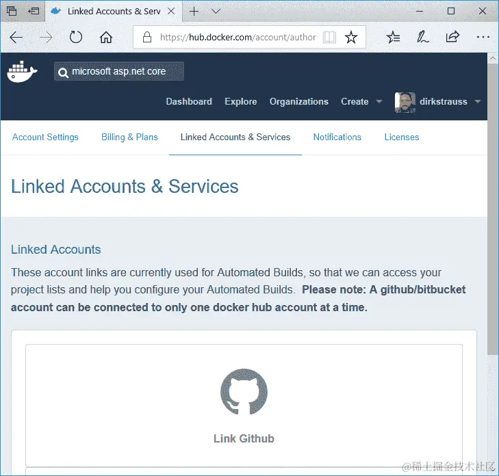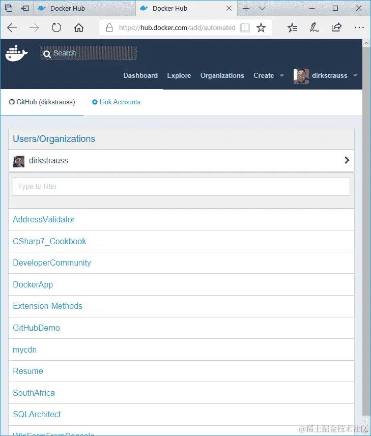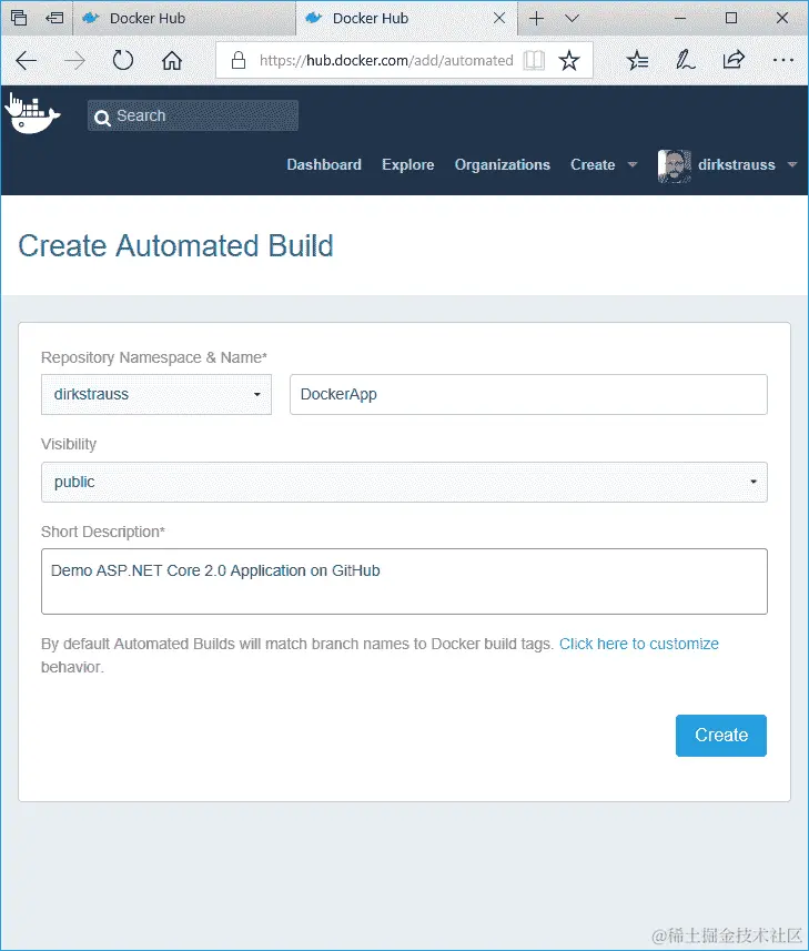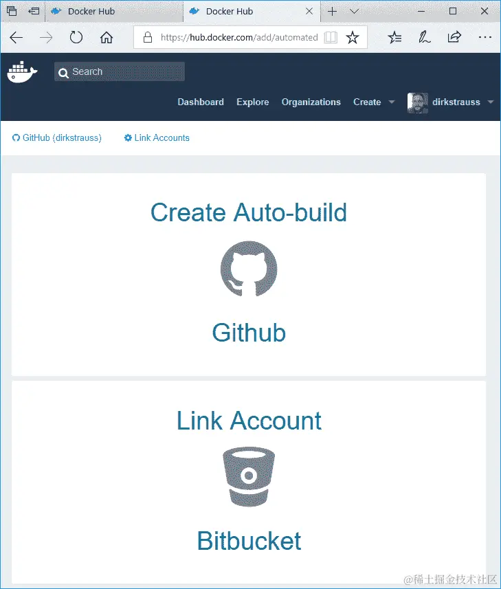 接下来的部分将说明如何设置 Docker Hub 以从 GitHub 存储库中的项目进行自动构建。