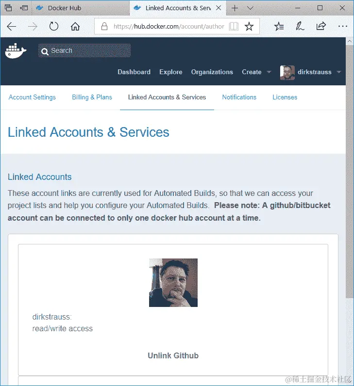 现在您将被带回“链接的帐户和服务”页面,在那里您将看到您 Docker Hub 配置文件上的已链接帐户: