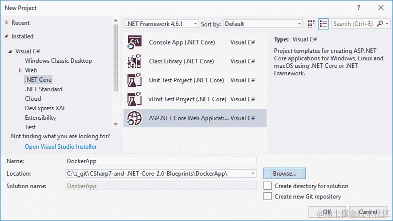 - 在 Visual Studio 2017 中创建一个新的 ASP.NET Core Web 应用程序,然后单击“确定”: