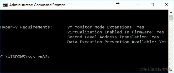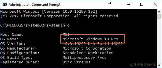 Docker CE 需要 Hyper-V,因此你需要运行 Windows 10 专业版或更高版本。要查看你的 Windows 版本,以管理员身份打开命令提示符,并在提示符处输入以下命令:
