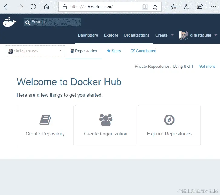 - 注册过程非常快速简单。您只需确认您的电子邮件地址,然后就可以使用了。确认电子邮件地址后,您将被提示再次登录。这将带您到 Docker Hub 仪表板。