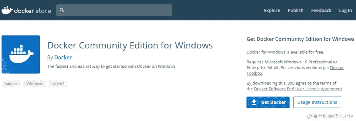 如前所述,Docker CE 可在 Windows 10 专业版和 Windows 10 企业版上下载。你可以从 Docker 商店下载安装程序:store.docker.com/editions/community/docker-ce-desktop-windows。