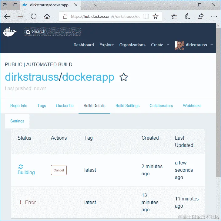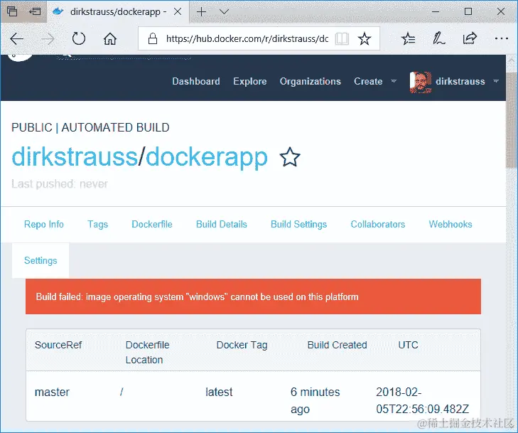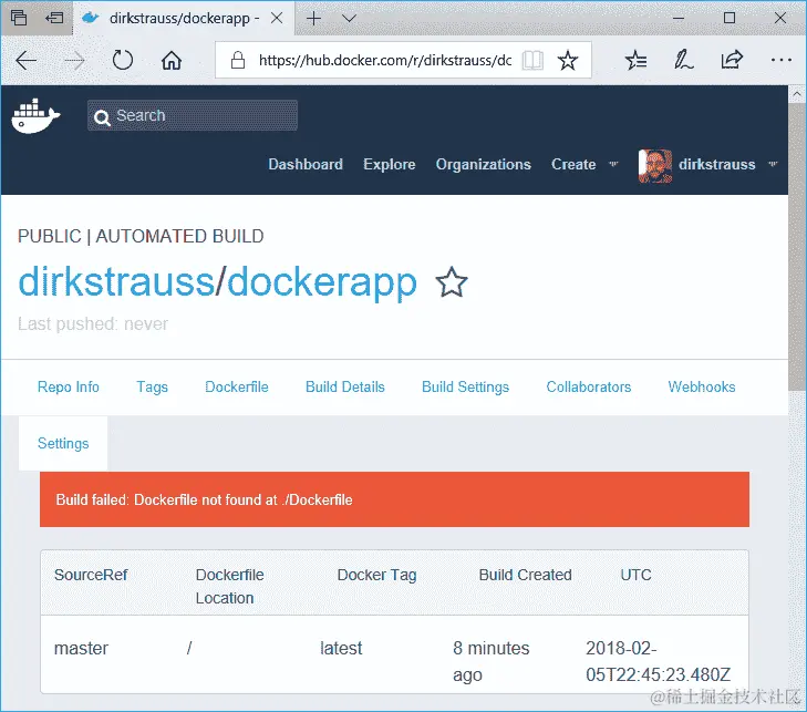- 刷新页面后,您会看到发生了错误。Docker Hub 将为您显示构建结果,您可以点击构建结果查看失败的详细信息。