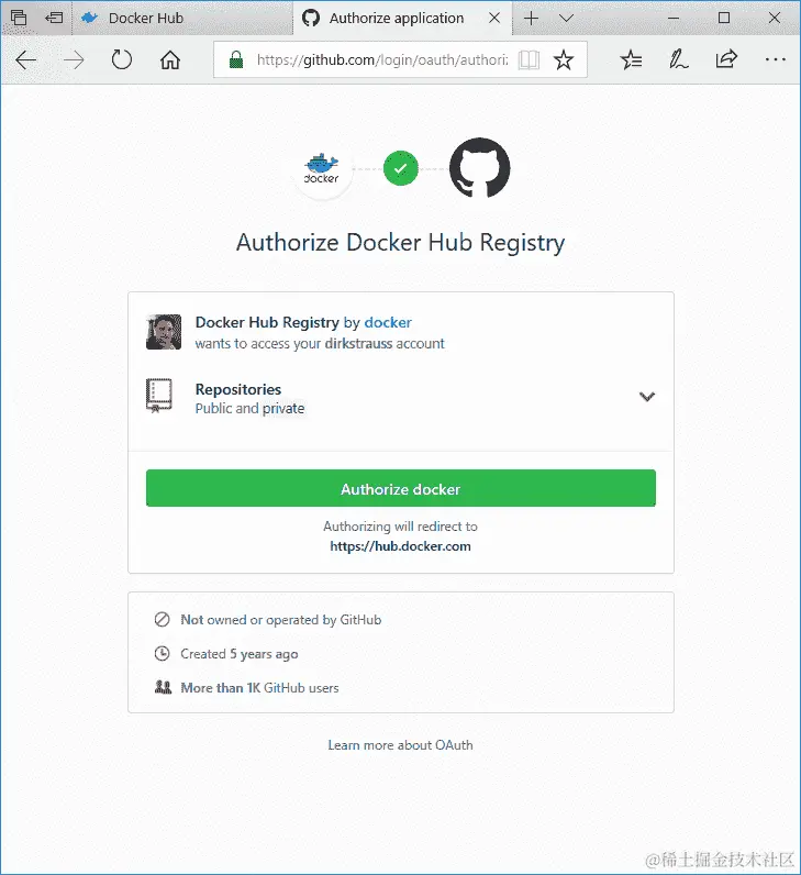 - 要授权 Docker Hub,点击“授权 docker”按钮: