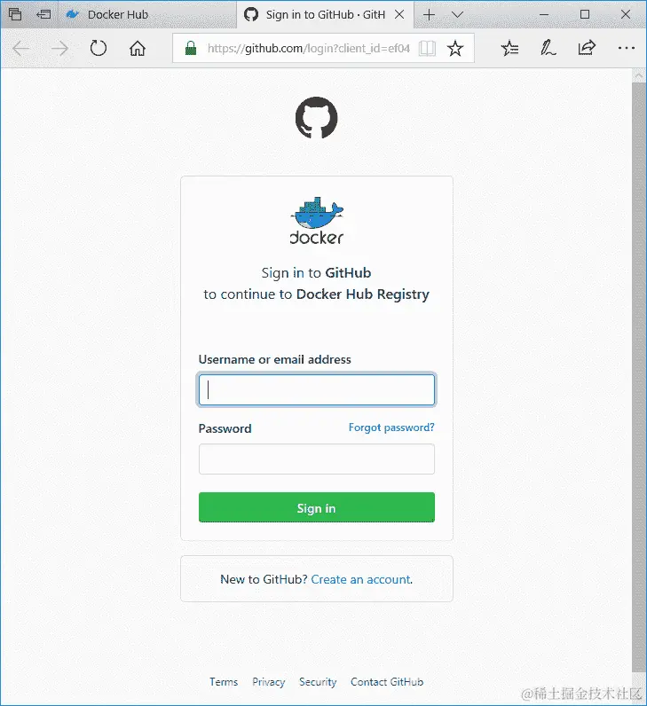 - Docker Hub 现在会重定向您到授权页面,以允许 Docker Hub 访问您的 GitHub 存储库。在这里,您需要使用您的 GitHub 凭据登录: