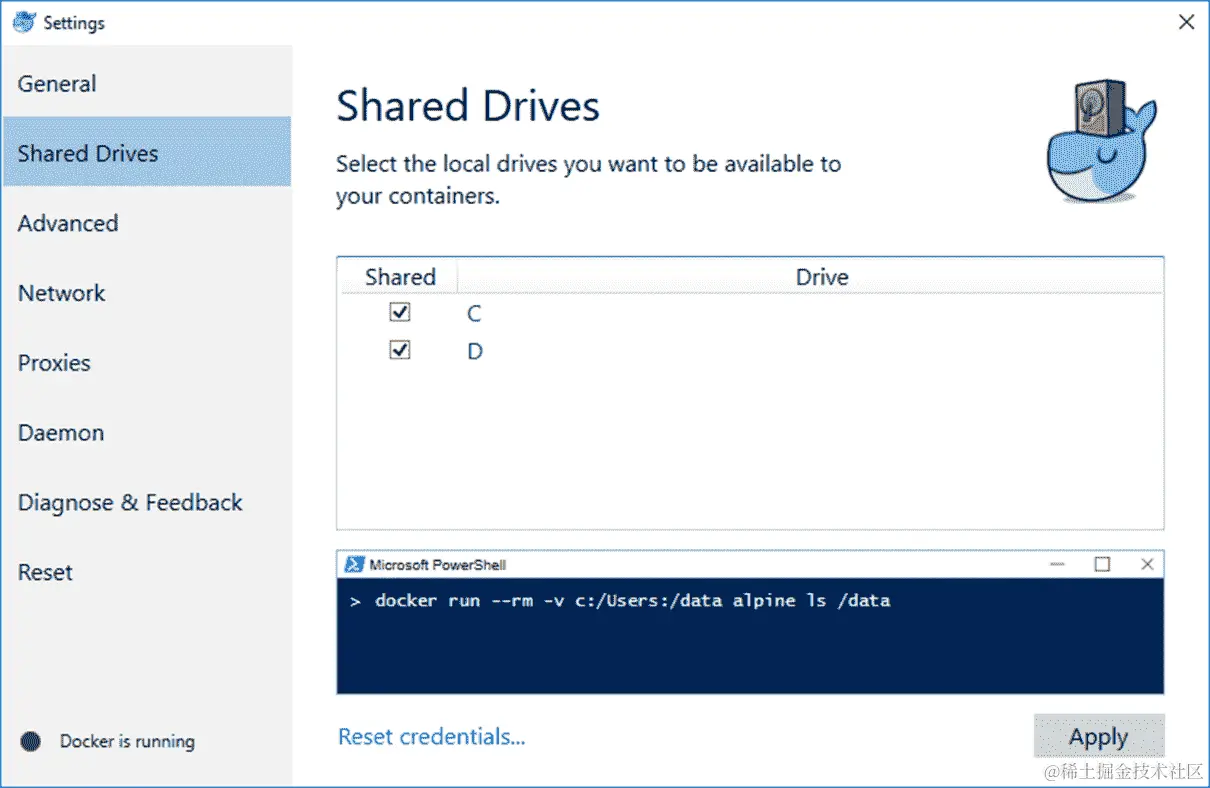 有关共享驱动器的更多信息,请参阅 Docker 文档docs.docker.com/docker-for-windows/#shared-drives。