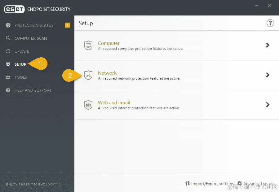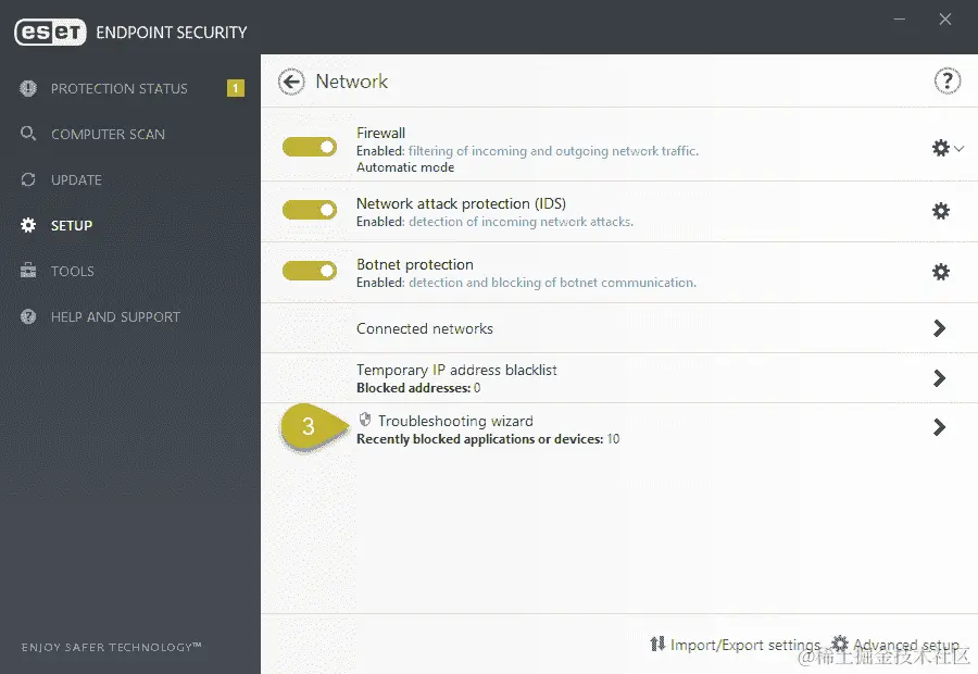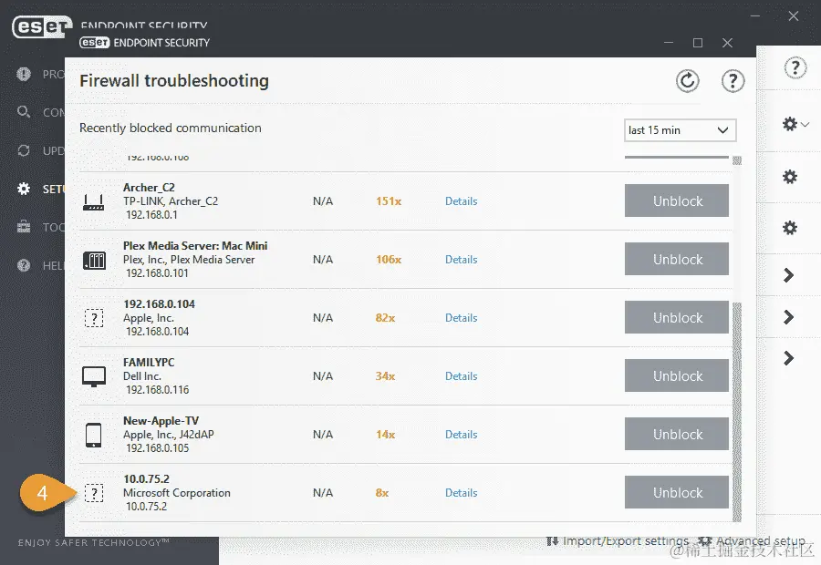 在我的情况下,是 ESET Endpoint Security 阻止了通信。您可能使用不同的防病毒软件,因此请查看它最近阻止的特定应用程序列表。在我的情况下,我启动了 ESET Endpoint Security 并选择了 SETUP,然后选择了 Network: