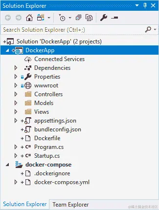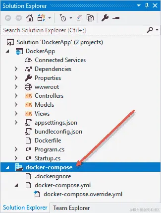 添加到 Visual Studio 的 Docker 支持不仅以 Dockerfile 的形式添加,还以 Docker 配置信息的形式添加。这些信息包含在解决方案级别的全局 docker-compose.yml 文件中: