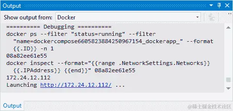 - 单击“Docker”按钮调试 ASP.NET Core 应用程序时,您会注意到“输出”窗口中会弹出一些内容。特别感兴趣的是最后的 IP 地址。在我的情况下,它显示 Launching http://172.24.12.112 (您的将不同):