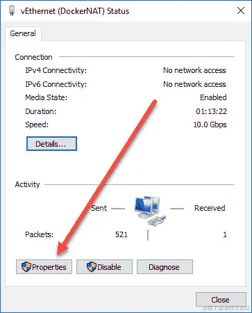 - 在 vEthernet(DocketNAT)状态窗口中,单击“属性”按钮: