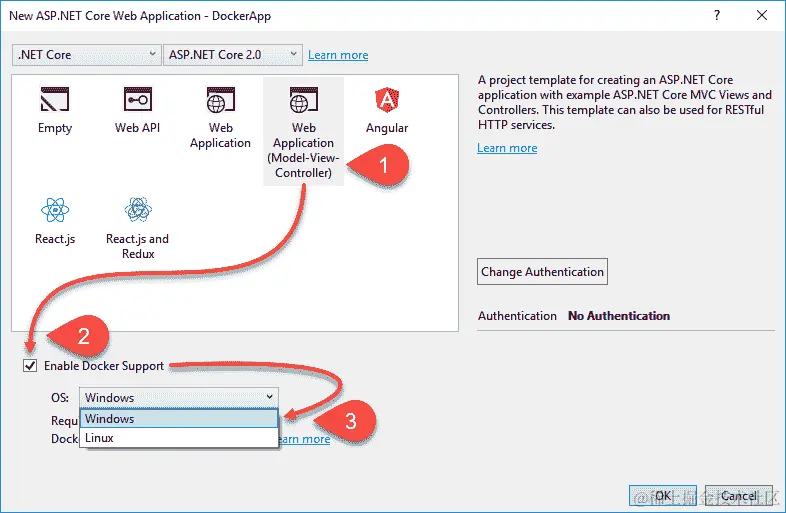 - 在下一个屏幕上,选择 Web 应用程序(模型-视图-控制器)或您喜欢的任何类型,同时确保从下拉列表中选择了 ASP.NET Core 2.0。然后勾选“启用 Docker 支持”复选框。这将启用操作系统下拉列表。在这里选择 Windows,然后单击“确定”按钮: