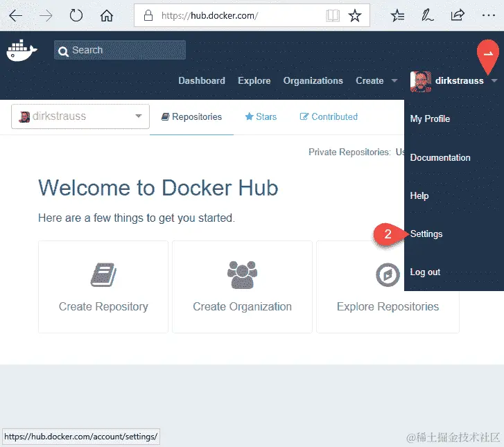 - 要开始使用 GitHub,我们首先需要将 Docker Hub 与 GitHub 链接起来。点击页面右上角选择的用户名,然后点击“设置”菜单选项: