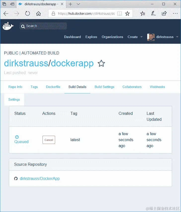 - 要测试这一点,打开 Visual Studio 2017 中的 ASP.NET Core 应用程序并进行一些更改。然后将这些更改提交到您的 GitHub 存储库。然后点击 Docker Hub 中的“构建详情”链接。您会看到构建已排队,并将在几分钟内完成。要查看构建结果,稍等一会后刷新此页面: