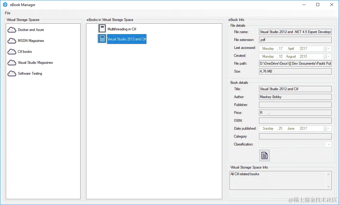 第一章,电子书管理和目录应用,介绍了 C# 7 引入的新功能,使开发人员能够编写更少的代码并提高生产力。我们将创建一个电子书管理应用程序。如果你和我一样,在硬盘和外部驱动器上都散落着电子书,这个应用程序将提供一个机制将所有这些不同的位置汇聚到一个虚拟存储空间中。该应用程序已经具备功能,但可以进一步增强以满足您的需求。