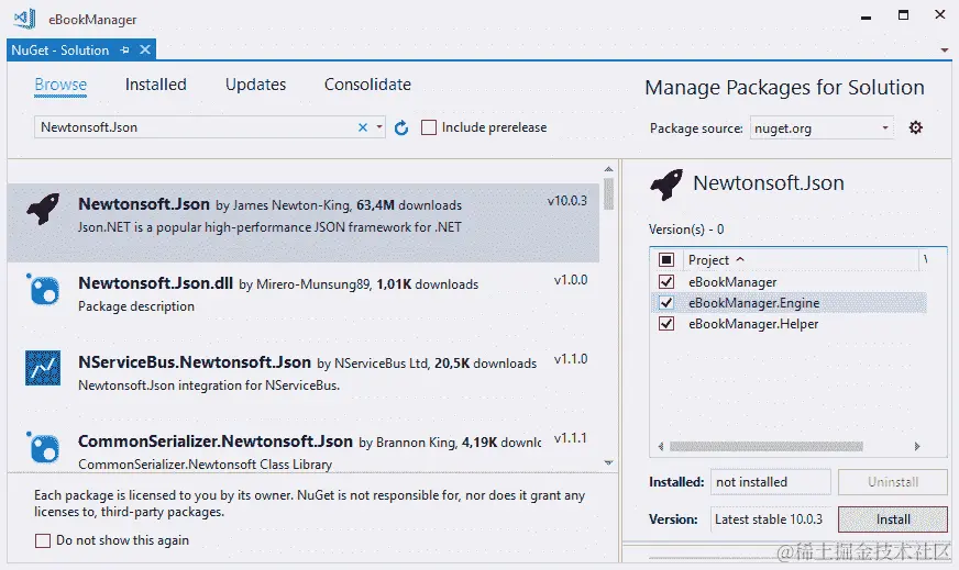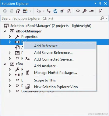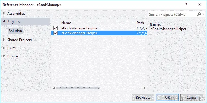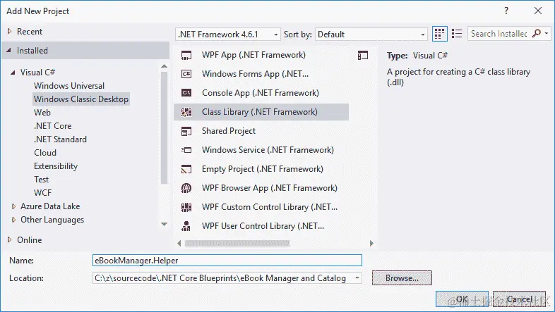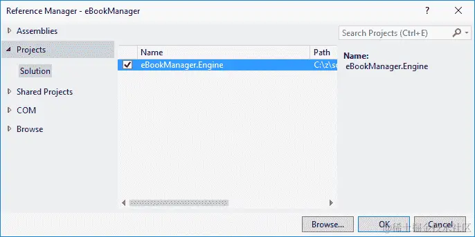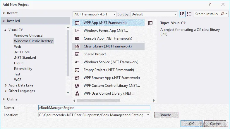 我们的解决方案需要一个类库项目来包含驱动eBookManager应用程序的类。在解决方案中添加一个新的类库项目,并将其命名为eBookManager.Engine: