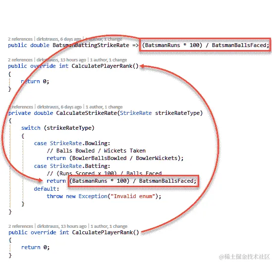 问题出现在击球率计算发生变化时(虽然不太容易发生,但让我们假设它发生了)。我们现在知道我们必须在两个地方改变计算。一旦开发人员只改变了一个计算而没有改变另一个,就会在我们的应用程序中引入一个 bug。