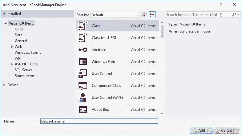 在eBookManager.Engine项目中,添加一个名为DeweyDecimal的类。如果您不想为您的电子书进行这种分类,可以不添加这个类。我包括它是为了完整起见。
