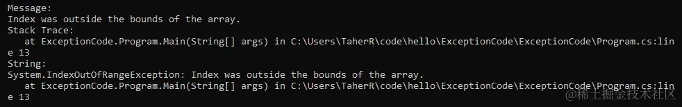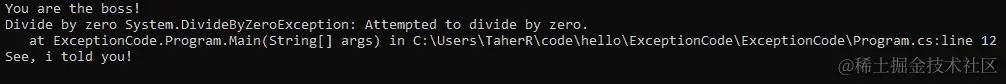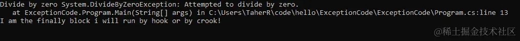您可以看到,如果运行上述代码,将执行DivideByZeroException catch块。