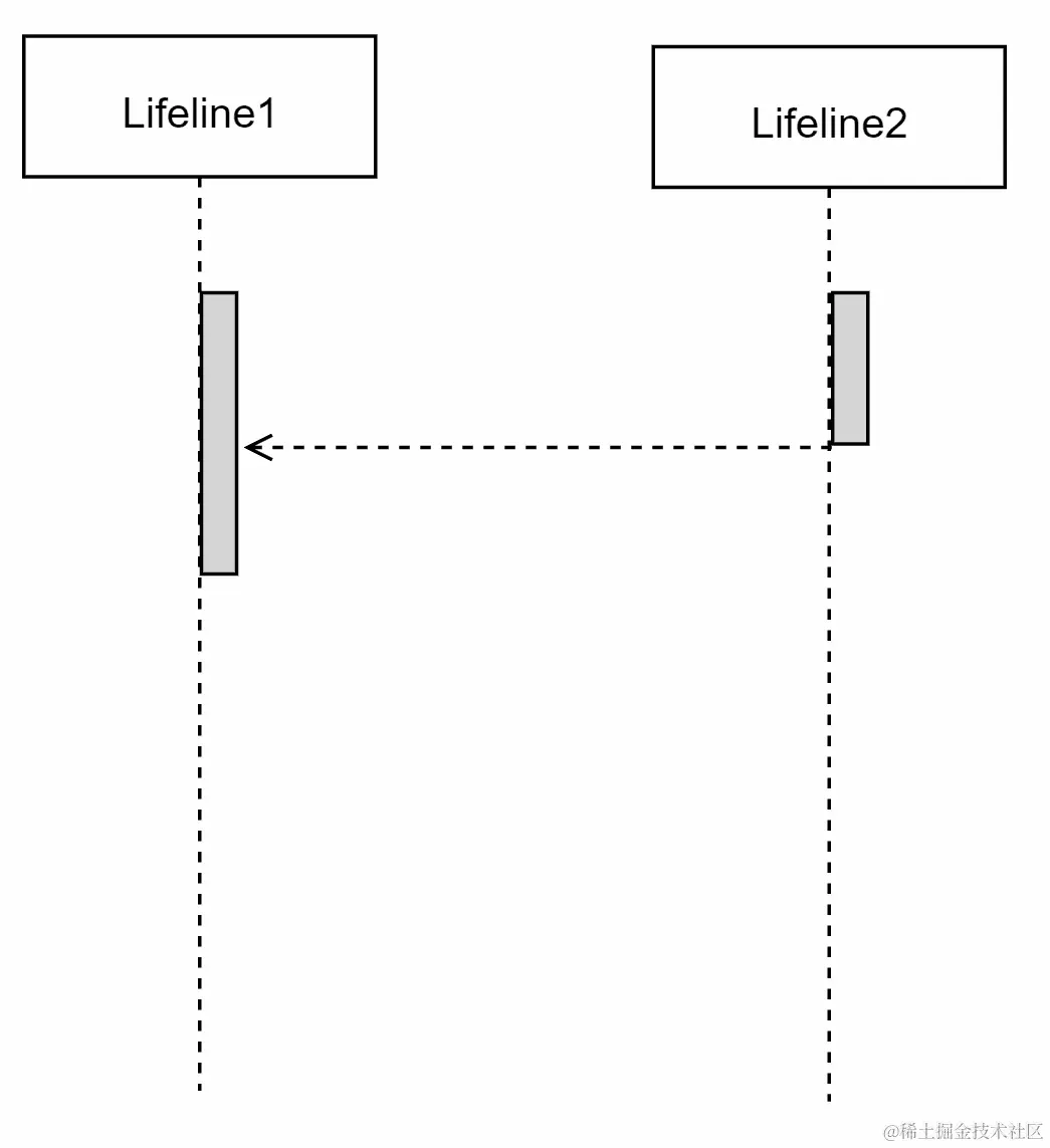 序列图中的正常消息流是从左到右的,因为这代表了动作命令;然而,有时消息会返回给调用者。一个返回消息从右到左流动,并且以一个带箭头头的虚线表示,如下图所示: