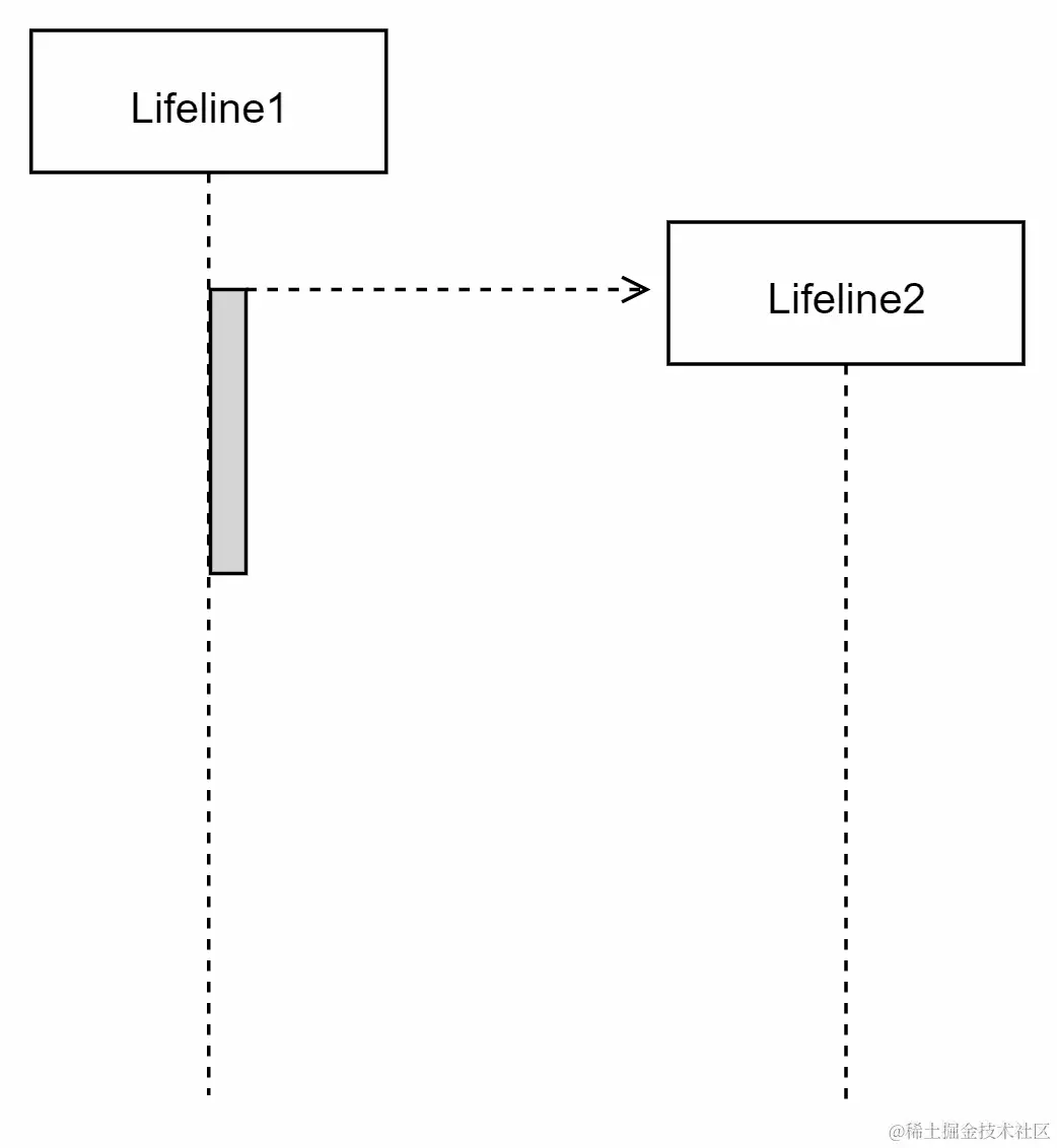 这种类型的消息不是普通的消息,比如一个呼叫消息。当一个生命线由另一个生命线创建时,会使用一个创建消息,如下图所示: