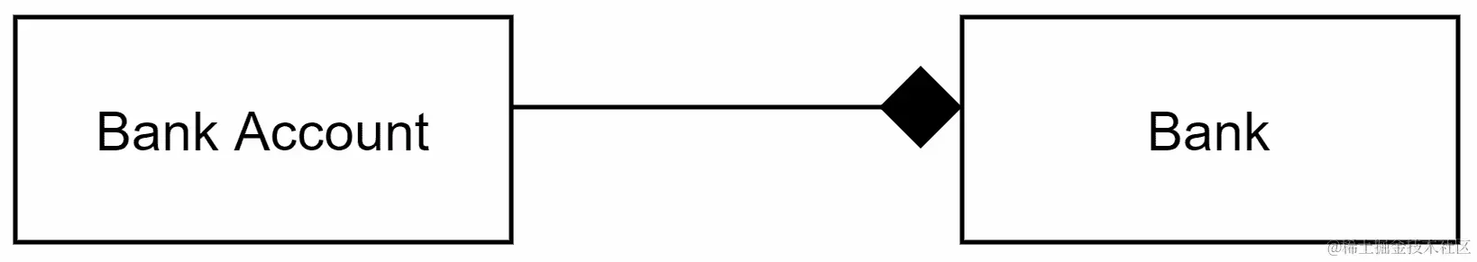 当一个类包含另一个类,并且依赖类不能没有超类而存在时,这是一种组合关系。例如,银行账户不能没有银行而存在,如下图所示: