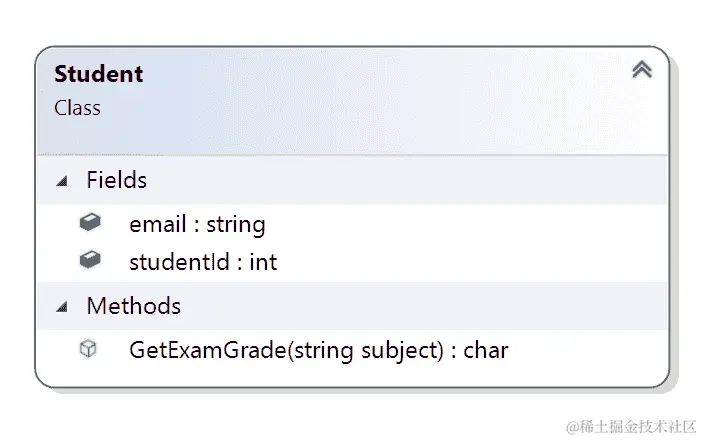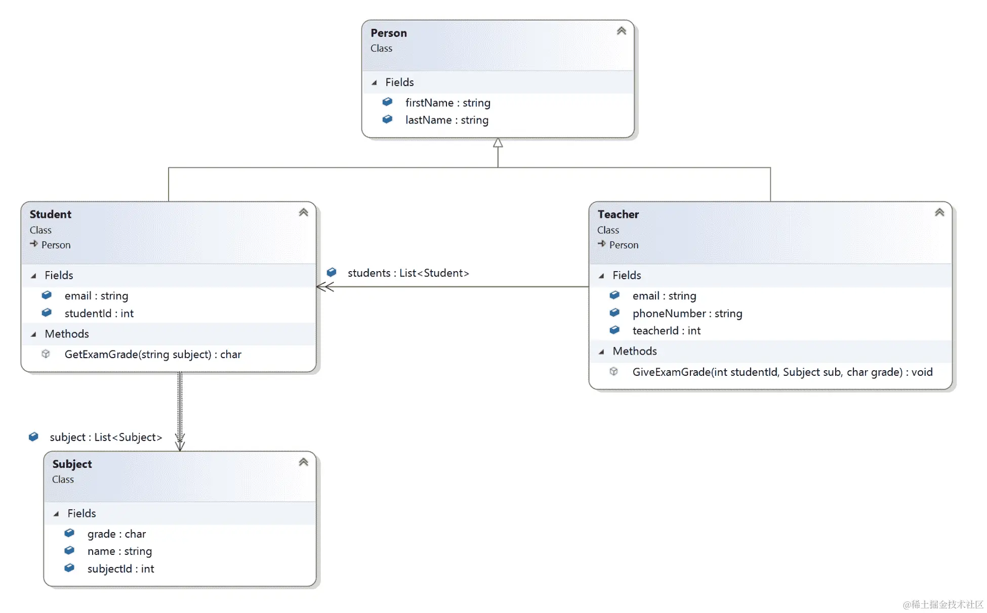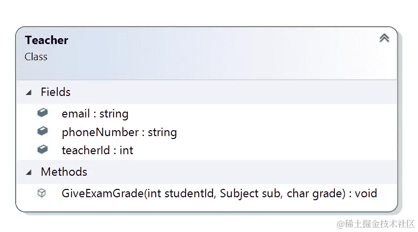 在这里,我们可以看到我们有一个Person类,有两个属性,FirstName和LastName。Student和Teacher类继承了Person类,所以我们可以看到箭头是空心的。Student类有两个属性,email和studentId。它还有一个名为GetExamGrade的方法(string subject),它接受学科的名称并返回char类型的成绩。我们可以看到另一个类Subject与Student有合成关系。Student有一个学科列表,而Subject类有三个属性,grade,name和subjectId。Teacher类有一个email,phoneNumber和teacherId,它们分别是string,string和int类型。Teacher类与Student类有一个关联关系,因为老师有一组学生在他们下面。Teacher类还有一个名为GiveExamGrade的方法,它接受三个参数,studentId,subject和grade。这个方法将设置学生学科的成绩。