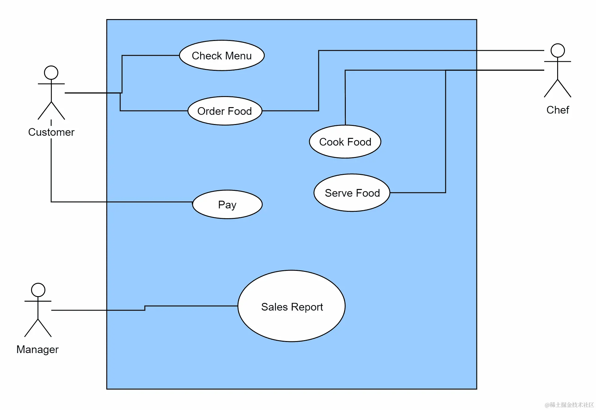 从上图可以看出,我们有三个角色(顾客、厨师和经理)。我们还有不同的用例——查看菜单、点餐、烹饪食物、上菜、支付和销售报告,这些用例与一个或多个角色相连。顾客参与了查看菜单、点餐和支付用例。厨师必须访问点餐以了解订单情况。厨师还参与了烹饪食物和上菜用例。与厨师和顾客不同,经理能够查看餐厅的销售报告。