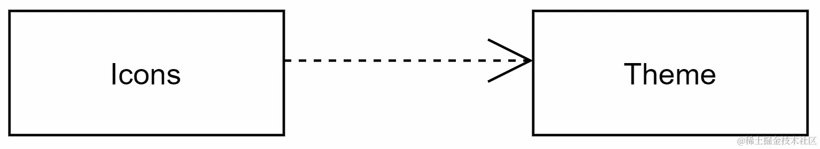 这种关系用虚线表示,末端有一个箭头。例如,让我们想象一下我们手机上有一个主题。如果我们改变主题,手机的图标会改变,所以图标对主题有依赖。这种关系在下面的图中显示: