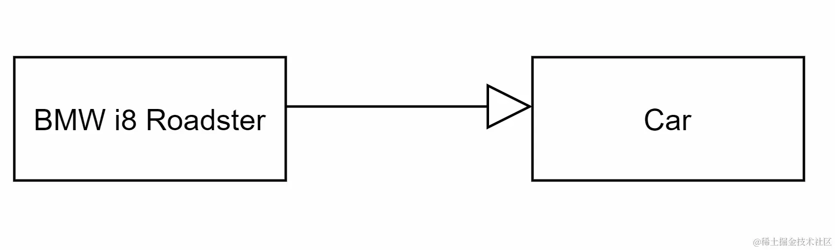 继承是一种类似于另一个类的关系,就像 BMW i8 Roadster 是一种汽车一样。这种关系使用一条线和一个空心箭头表示。箭头从类指向超类,如下图所示: