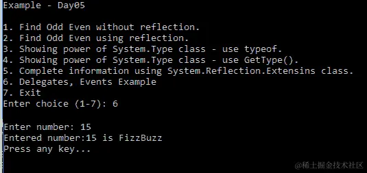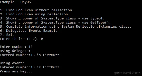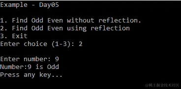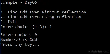 在前面的代码中,我们可以使用Assembly.CreateInstance("OddEven")来代替Activator.CreateInstance(typeof(OddEven))。Assembly.CreateInstance查看程序集的类型,并使用Activator.CreateInstance创建实例。有关Assembly,CreateInstance的更多信息,请参阅:docs.microsoft.com/en-us/dotnet/api/system.reflection.assembly.createinstance?view=netstandard-2.0#System_Reflection_Assembly_CreateInstance_System_String_。
