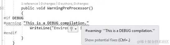 上述代码将在编译时发出警告,并且警告消息将是您使用#warning指令提供的内容: