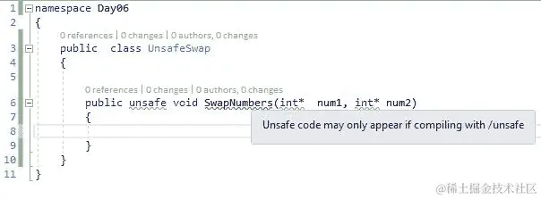 设置不安全编译后,让我们编写代码使用指针交换两个数字,考虑以下代码片段: