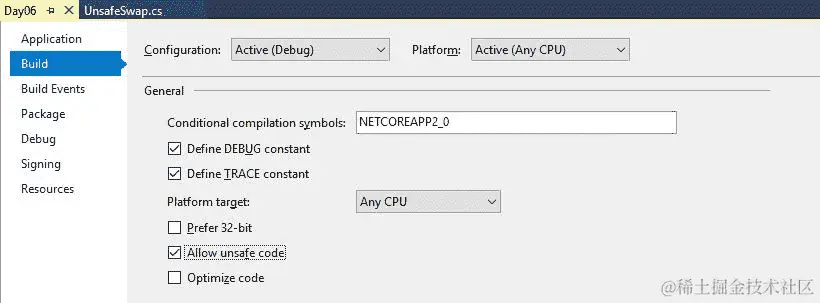 在本节中,我们将讨论如何使用 Visual Studio 编写不安全代码的介绍。语言 C#提供了一种编写代码的方式,该代码编译并创建对象,这些对象在根下由垃圾收集器管理有关垃圾收集器的更多详细信息,请参考[第 01 天]。简而言之,C#不像使用函数指针访问引用的 C、C++语言。但是在某些情况下,有必要在 C#语言中使用函数指针,类似于支持函数指针的语言如 C 或 C++,但 C#语言不支持它。为了克服这种情况,我们在 C#语言中有不安全代码。有一个修饰符不安全,告诉编译器这段代码不受垃圾收集器控制,在该块内我们可以使用函数指针和其他不安全的东西。要使用不安全代码,我们首先要求编译器从 Visual Studio 2017 或更高版本开始设置不安全编译,只需转到项目属性,在“生成”选项卡上,选择“允许不安全代码”选项,参考以下截图: