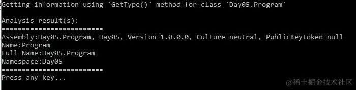 在同一个节点上,我们可以使用System.Type类的GetType()方法,该方法获取类型并提供信息。让我们分析和讨论以下代码片段:
