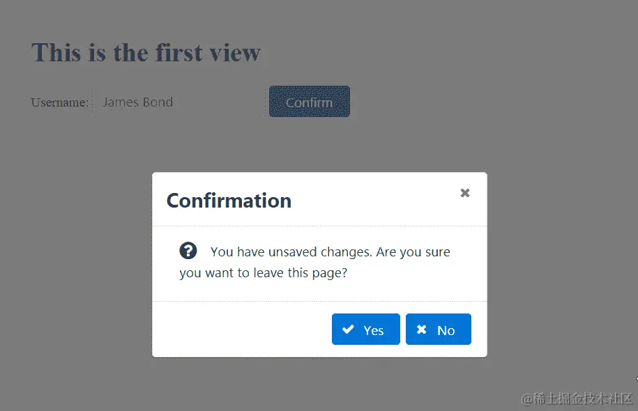 点击按钮组件后,对话框出现。以下截图显示了基本确认对话框示例的快照结果: