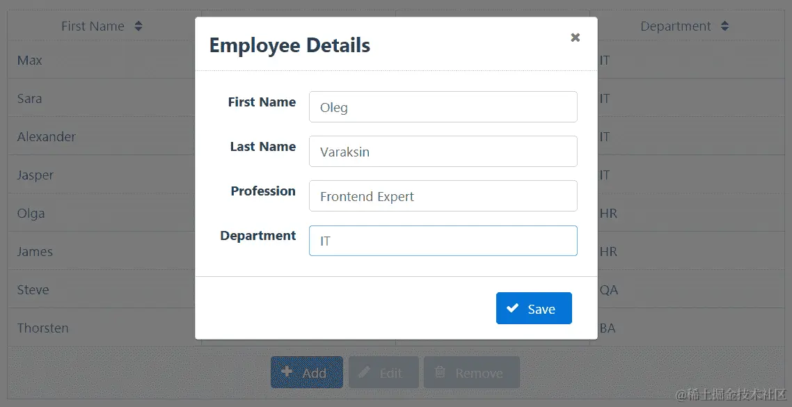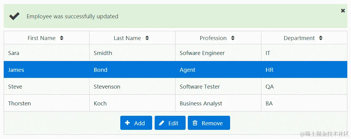 在组件类中,我们通过调用store.dispatch(action)来接收操作并分派它们。操作的分派仅将演示两个 CRUD 操作:加载所有员工和删除一个员工: