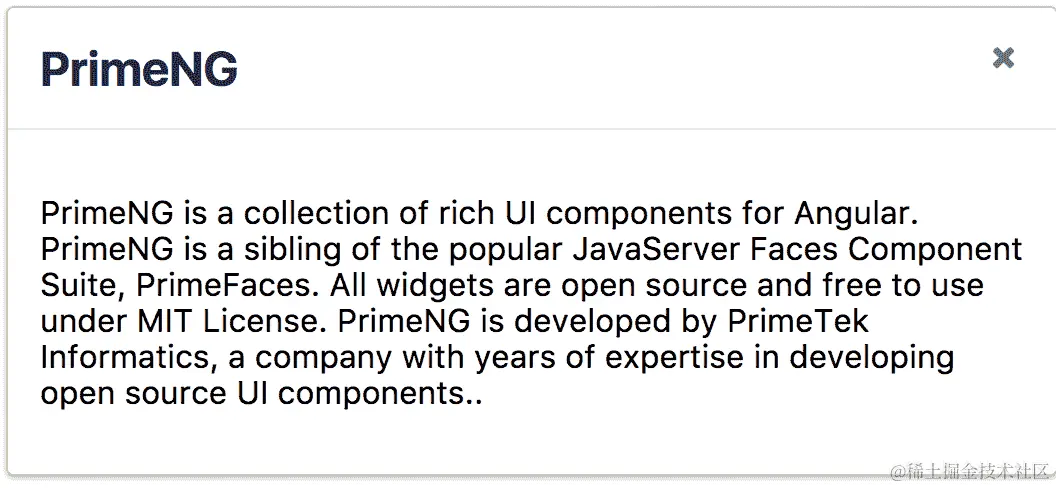 默认情况下,对话框以false的visibility隐藏,并启用visible属性显示对话框。由于对话框具有双向绑定的特性,使用关闭图标关闭对话框后,visible属性会自动变为false。closeOnEscape属性用于使用Esc键关闭对话框。