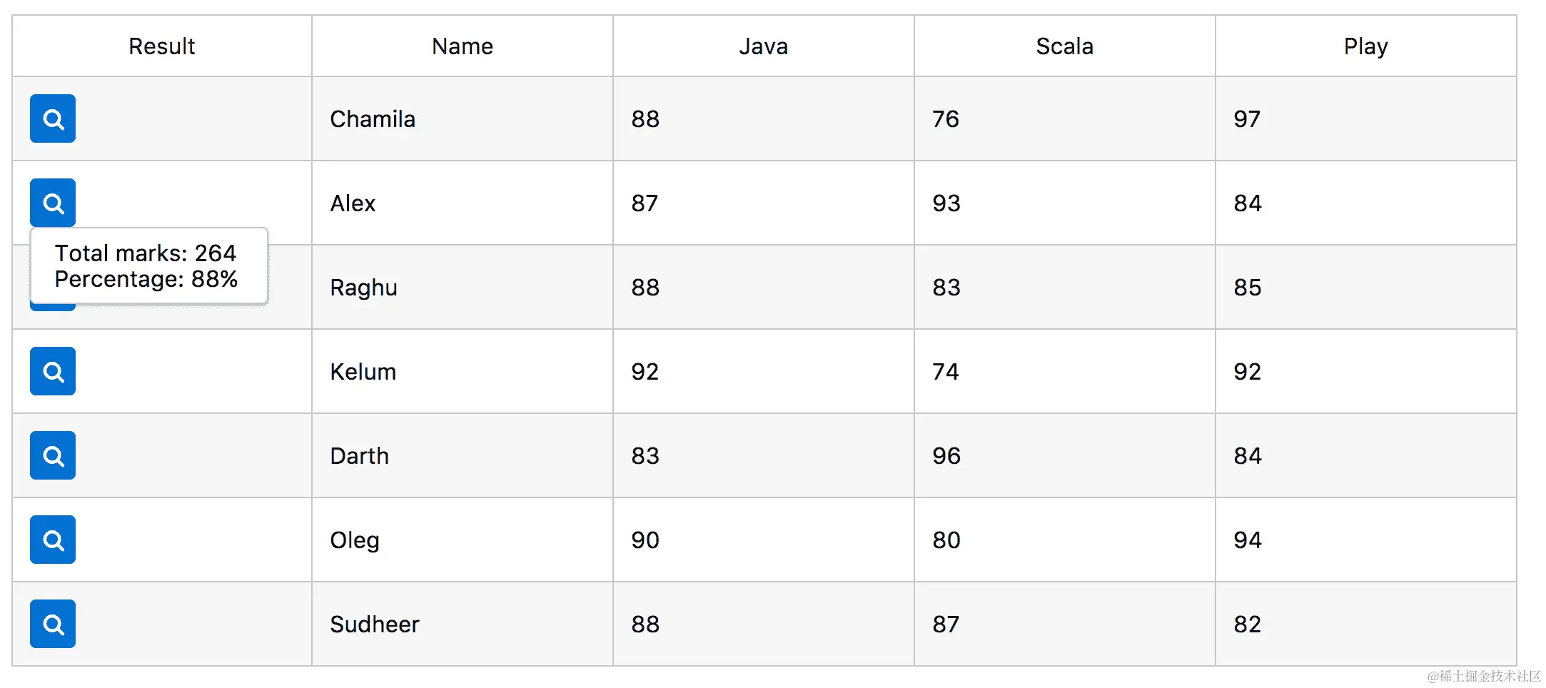 OverlayPanel 组件也可以与其他 PrimeNG 组件集成。例如,下面的快照显示了如何使用 ng-template 将 Overlay 组件与 DataTable 组件集成。在这种情况下,按钮需要放置在 DataTable ng-template 内,并通过 toggle 事件触发 Overlay:
