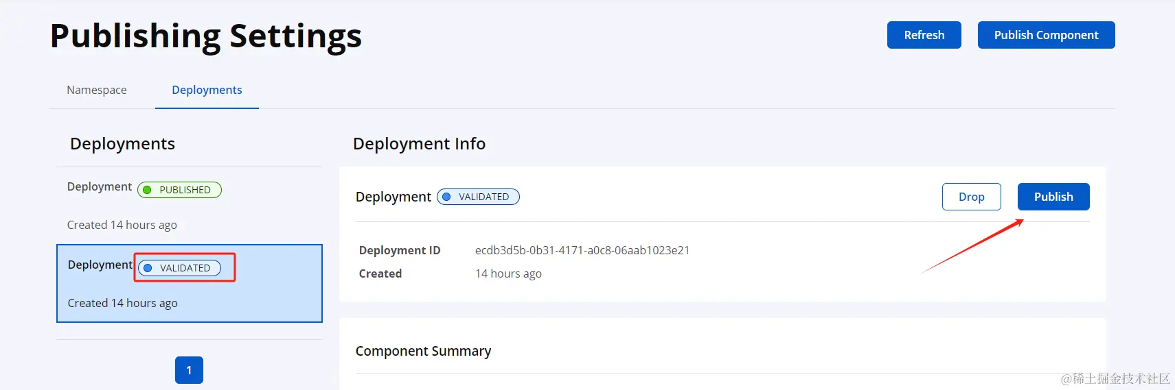 在maven执行deploy成功后,回到sonatype的publish里的Deployments可以查看到验证成功可用于发布的包内容,在VAILDATED状态包的发布信息中点击Publish后,项目会自动发到中央仓库里并且状态对应改成PUBLISHED
