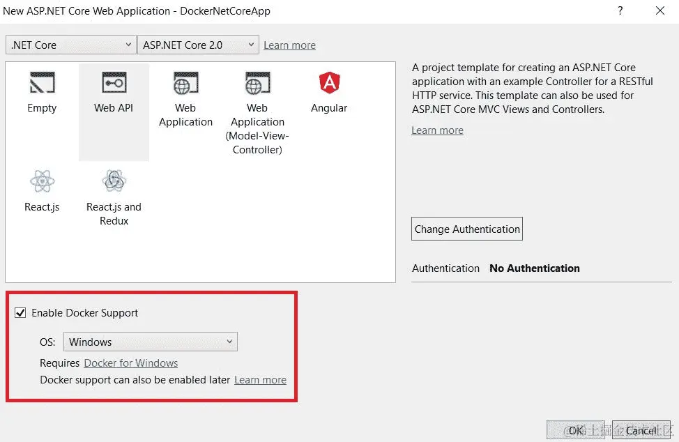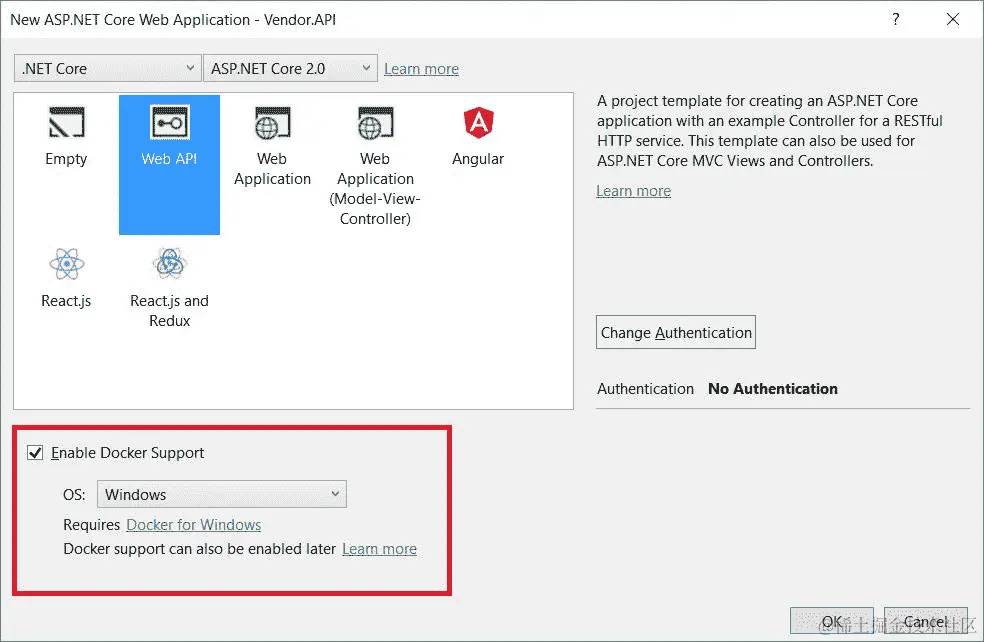 在本节中,我们将在.NET Core 中创建一个示例应用程序,并定义包括授权服务器、供应商服务和订单服务在内的服务。首先,我们可以使用 Visual Studio 2017 或 Visual Studio Code,并使用 dotnet 命令行界面(CLI)工具创建项目。选择 Visual Studio 2017 的优势在于,在创建项目时提供了一个选项,可以启用 Docker 支持,添加与 Docker 相关的文件,并将 Docker 设置为启动项目: