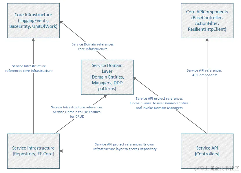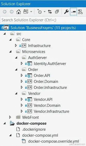 在上述结构中,我们有根文件夹,即核心,微服务和WebFront。共同和核心组件驻留在核心中,所有微服务驻留在微服务文件夹中,WebFront包含前端项目,很可能是 ASP.NET MVC Core 项目,移动应用程序等。