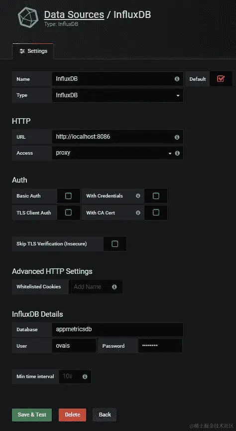 为了继续,我们将转到 Grafana 网站上的数据源部分,并单击添加新数据源选项。以下是为 InfluxDB 数据库添加数据源的配置: